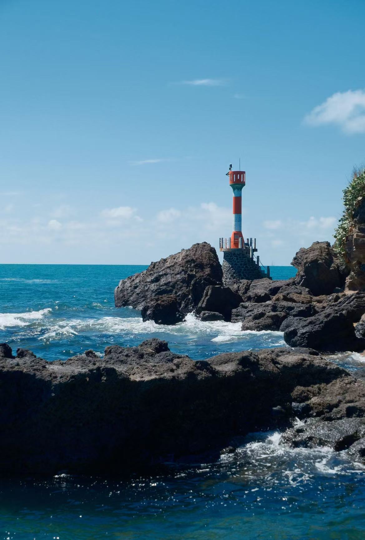 早餐后乘坐第一班客轮前往涠洲岛。首先来到滴水丹屏,层层叠叠的海蚀纹理,翠绿的藤蔓。这里的沙子干净而柔软,绵长的沙滩一头连接灯塔,一头连着石螺口。随后来到石螺口沙滩,脚踩细软的沙滩,沿着海边一直漫步。